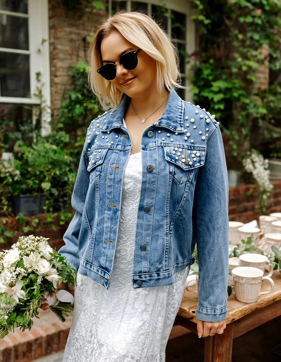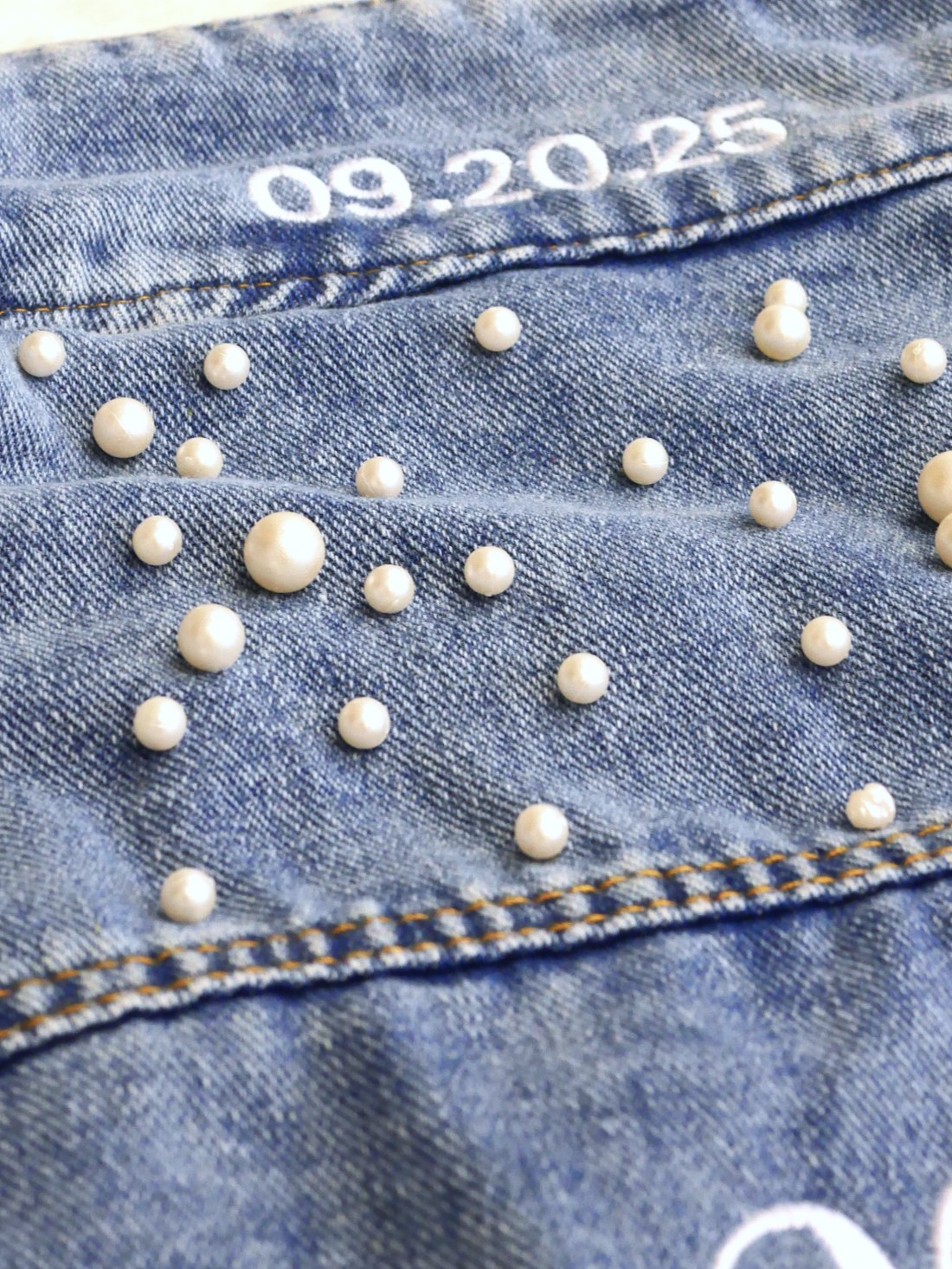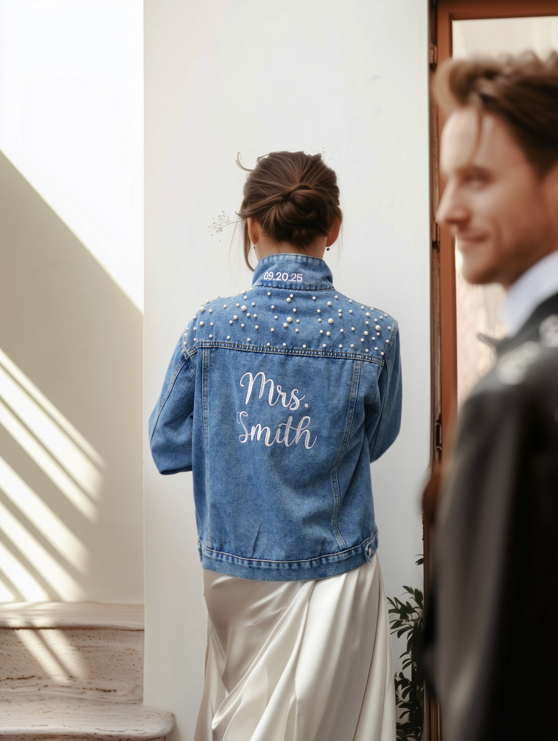 It’s a personalized denim jacket, made just for you — with your new last name and hand-applied pearl details. It’s stylish, meaningful, and photo-perfect for your wedding day.